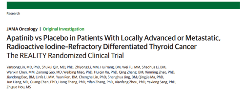 2021年12月16日,权威医学杂志《JAMA Oncology》(影响因子31.777)在线发表阿帕替尼的一项III期临床研究(REALITY)——甲磺酸阿帕替尼片治疗局部进展/转移性放射性碘难治性分化型甲状腺癌(RAIR-DTC)患者的多中心、随机、双盲、安慰剂对照临床研究。此研究由北京协和医院的林岩松教授和南京金陵医院的秦叔逵教授发起,在全国21个研究中心展开,由壹号娱乐医药中央医学事务部团队支持完成。