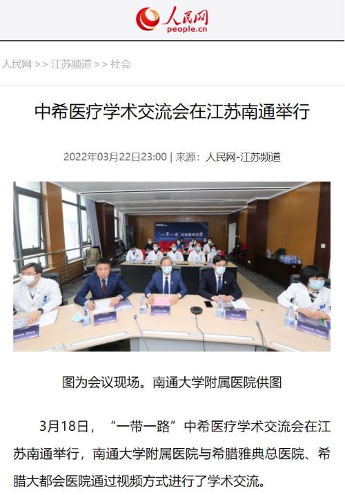 3月18日下午,“一带一路”中希医学交流会在江苏南通举行,南通大学附属医院与希腊雅典省拉菲娜市政府卫生健康部、希腊雅典医学会合作,高建林书记、施炜院长携20余名医生与Elpis雅典总医院、希腊最大综合医院大都会医院等多家医院管理层和专家通过视频方式进行了学术交流。壹号娱乐医药国际交流部提供全程支持,人民网等权威媒体进行了宣传报道。