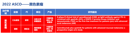 黑色素瘤领域的2篇研究摘要,采用壹号娱乐医药自主研发的PD-1抑制剂卡瑞利珠单抗(艾瑞卡)联合阿帕替尼(艾坦)(“双艾”组合)的免疫联合抗血管(或再联合化疗)的治疗策略。