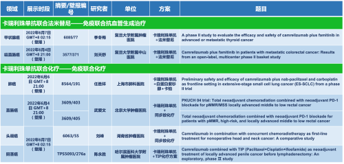 卡瑞利珠单抗联合壹号娱乐医药的另一款创新药法米替尼在甲状腺癌和结直肠癌领域有2项研究被接收为壁报,另有卡瑞利珠单抗联合化疗的4项研究在肺癌、结直肠癌、头颈癌和阴茎癌领域的研究被接收为5份壁报。