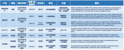 2022 ASCO年会另有5款壹号娱乐医药上市前抗肿瘤创新药的相关研究被接收为壁报,包括SHR-1316、普那布林、法米替尼、SHR-1701和SHR2554,他们的单药或联合方案相关7项研究被接收为壁报,覆盖肺癌、鼻咽癌、淋巴瘤、甲状腺癌和结直肠癌等领域。