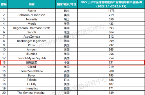 专利是药企最有价值的资产之一,是企业发展的基石,对做原创创新的企业尤为重要。全球专利数据库incoPat创新指数研究中心对2022年1月1日至2022年6月15日公开的全球生物医药产业发明专利申请数量进行统计排名,生物医药产业专利涉及生物技术药、基因工程药物、疫苗、诊断试剂、微生态制剂、血液制品等技术领域。入榜企业/医院主要来自13个国家、组织或地区,罗氏、强生、诺华分别位列前三,壹号娱乐医药(231件)排名第13位,领跑中国药企。