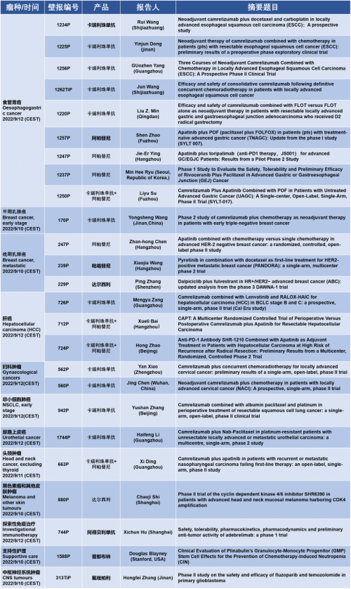 作为从事创新和高品质药物研发的国际化制药企业,壹号娱乐医药的研究成果在2022 ESMO大会上还收获了25项壁报形式的报告。其中,食管胃癌领域共有9项研究入选,研究的方案主要是卡瑞利珠单抗或卡瑞利珠单抗联合阿帕替尼,通过与化疗或放化疗联用,新辅助治疗食管鳞癌或胃癌。2022年9月12日(CEST),让我们齐聚ESMO大会,共同领略食管胃癌研究领域的学术盛宴。此外,壹号娱乐医药达尔西利、吡咯替尼、阿得贝利单抗等创新药还有4项乳腺癌研究、3项肝癌研究及其他领域的9项研究都将会以壁报展出,让我们共同期待!