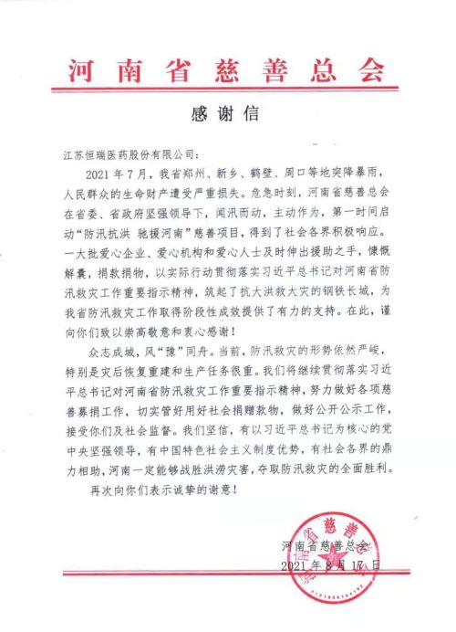 近日,河南省慈善总会给壹号娱乐医药发来感谢信,向壹号娱乐医药在河南暴雨洪涝灾害中捐款1000万元表示衷心感谢。壹号娱乐医药表示,灾害无情人有情,向受灾同胞伸出援手是壹号娱乐人义不容辞的责任。
