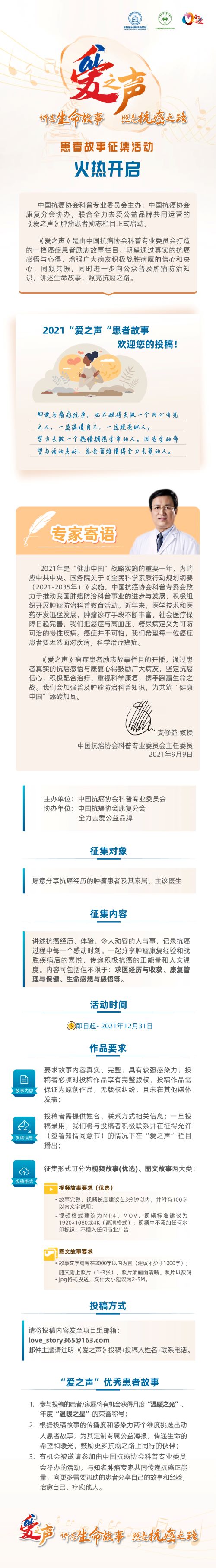 中国抗癌协会科普专业委员会主任委员支修益教授指出:“2021年是‘健康中国’战略实施的重要一年。为积极响应并贯彻实施中共中央、国务院关于《全民科学素质行动规划纲要(2021-2035年)》,中国抗癌协会科普专委会始终致力于推动我国肿瘤防治科普事业的进步与发展,积极组织开展肿瘤防治科普教育活动。期望通过《爱之声》肿瘤患者励志故事栏目,以真实的抗癌感悟与康复心得鼓励广大病友,坚定抗癌信心,积极配合治疗、重视科学康复,携手打赢生命之战,为共筑‘健康中国’添砖加瓦。”