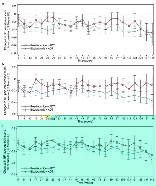 在整个研究中,BPI-SF和FACT-P的患者依从性很高,在第161周之前,两个治疗组的依从性均超过90%。只有25例患者(3.8%)错过三次或更多计划的疼痛评估。基线评估显示两组的疼痛水平较低,瑞维鲁胺+ADT组中有203例(62%)患者、对照组中有206例(63%)患者在基线时报告无疼痛,仅分别有17%和15%的患者报告轻度疼痛。基线FACT-P评分表明,瑞维鲁胺+ADT组和对照组的功能状态相似。