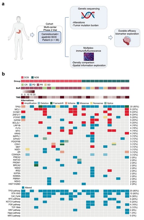 图2. 探索性研究概要(a)及研究队列的基因组特征(b)