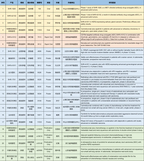 在肺癌、妇科肿瘤、淋巴瘤、膀胱癌、头颈肿瘤、黑色素瘤、肉瘤、鼻咽癌、脊索瘤、唾液腺癌、胸腺癌、硬纤维瘤、涎腺导管癌等其他多个疾病领域,卡瑞利珠单抗、阿帕替尼、阿得贝利单抗、吡咯替尼、达尔西利、氟唑帕利、法米替尼、SHR-1501、瑞拉芙普-α(SHR-1701)、SHR-1826、瑞康曲妥珠单抗(SHR-A1811)、SHR-A1912、SHR-A2102等抗肿瘤创新药相关研究一共入选了4项口头报告、2项快速口头报告、11项壁报展示和4项线上发表,彰显了壹号娱乐医药强劲的研发实力。此外,昂丹司琼口溶膜在防治化疗导致的恶心呕吐方面展现出了良好的疗效,本次ASCO年会有1项研究线上发表。
