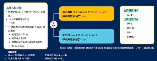 达尔西利(Dalpiciclib)是壹号娱乐医药自主研发的口服、选择性的小分子CDK4/6抑制剂,也是中国首个自主研发的新型高选择性 CDK4/6 抑制剂,已证实其与内分泌治疗(ET)联合用于 HR+/HER2- 晚期乳腺癌的一线和后线治疗时,均显著改善无进展生存期(PFS)6,7。因此开展了一项随机、双盲、III期临床试验(DAWNA-A),以进一步评估达尔西利联合内分泌治疗作为高危早期 HR+/HER2 - 乳腺癌辅助治疗的效果。本研究纳入高危复发风险人群需满足以下标准之一:①≥4 枚阳性腋窝淋巴结;②1–3枚阳性腋窝淋巴结且合并≥1 项高危因素(肿瘤直径 ≥5 cm,组织学分级3级,辅助治疗后残留浸润性乳腺癌,Ki-67 ≥30%)。本文呈现预先设定的首次中期分析(IA1)结果。