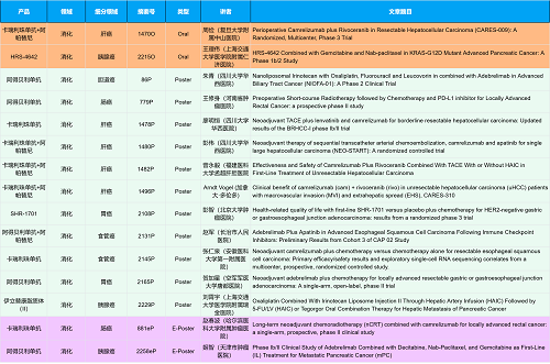在消化系统肿瘤领域,壹号娱乐创新产品相关研究共入选2项口头报告、10项壁报和2项电子壁报,共14项研究。除了明星药物卡瑞利珠单抗和阿帕替尼外,还有5篇阿得贝利单抗治疗消化系统肿瘤的研究入选。此外,HRS-4642、瑞拉芙普-α注射液(SHR-1701)等未上市创新产品也有相应研究入选。随着新老药物前沿研究的不断推进,有望为消化系统肿瘤患者带来新的福音!