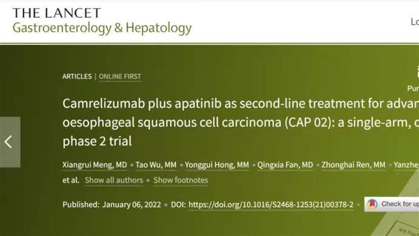 壹号娱乐卡瑞利珠单抗联合阿帕替尼最新研究成果荣登《柳叶刀·肿瘤》